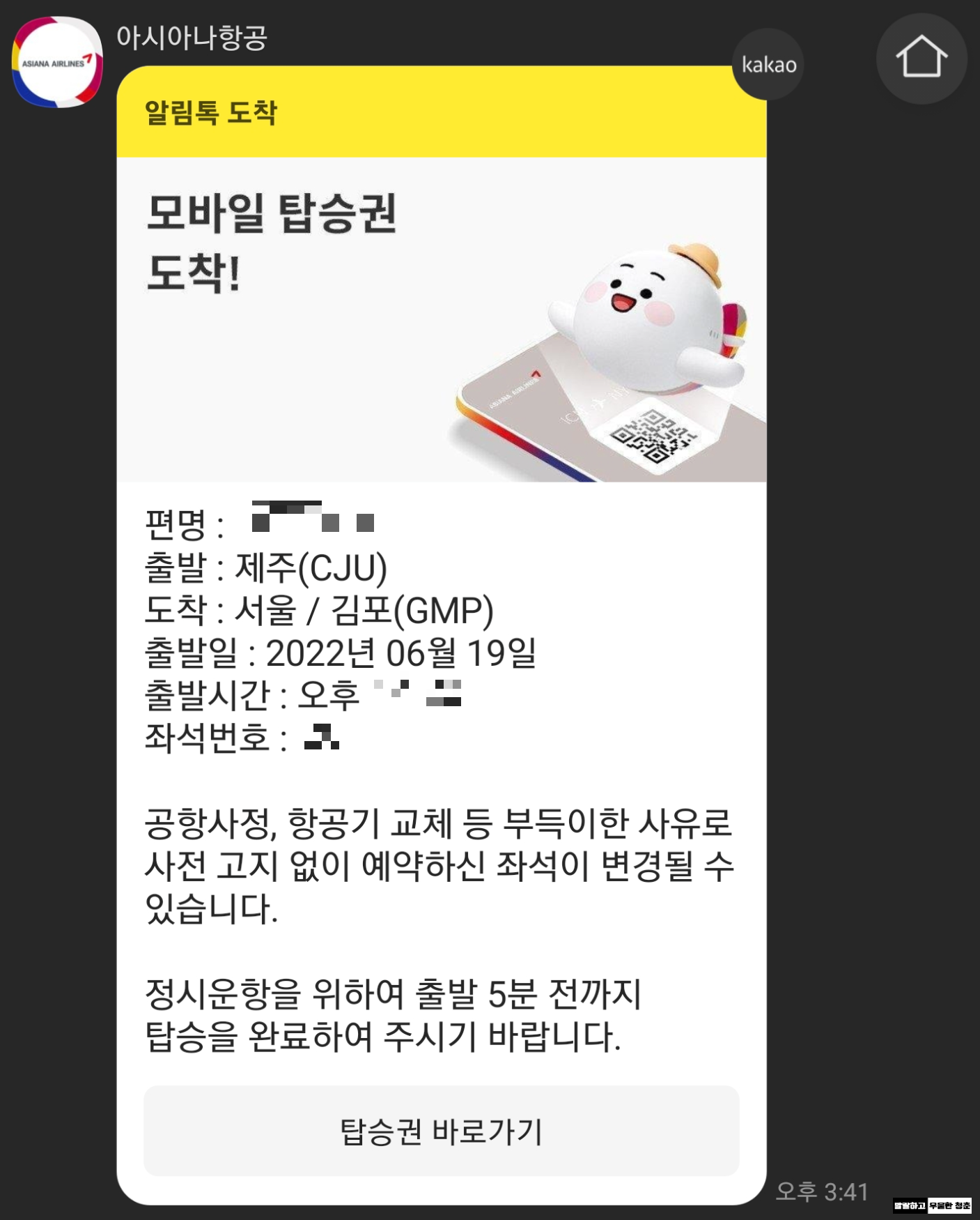 아시아나 항공의 경우 셀프체크인을 할 수 있게 카카오톡으로 연락이 온다