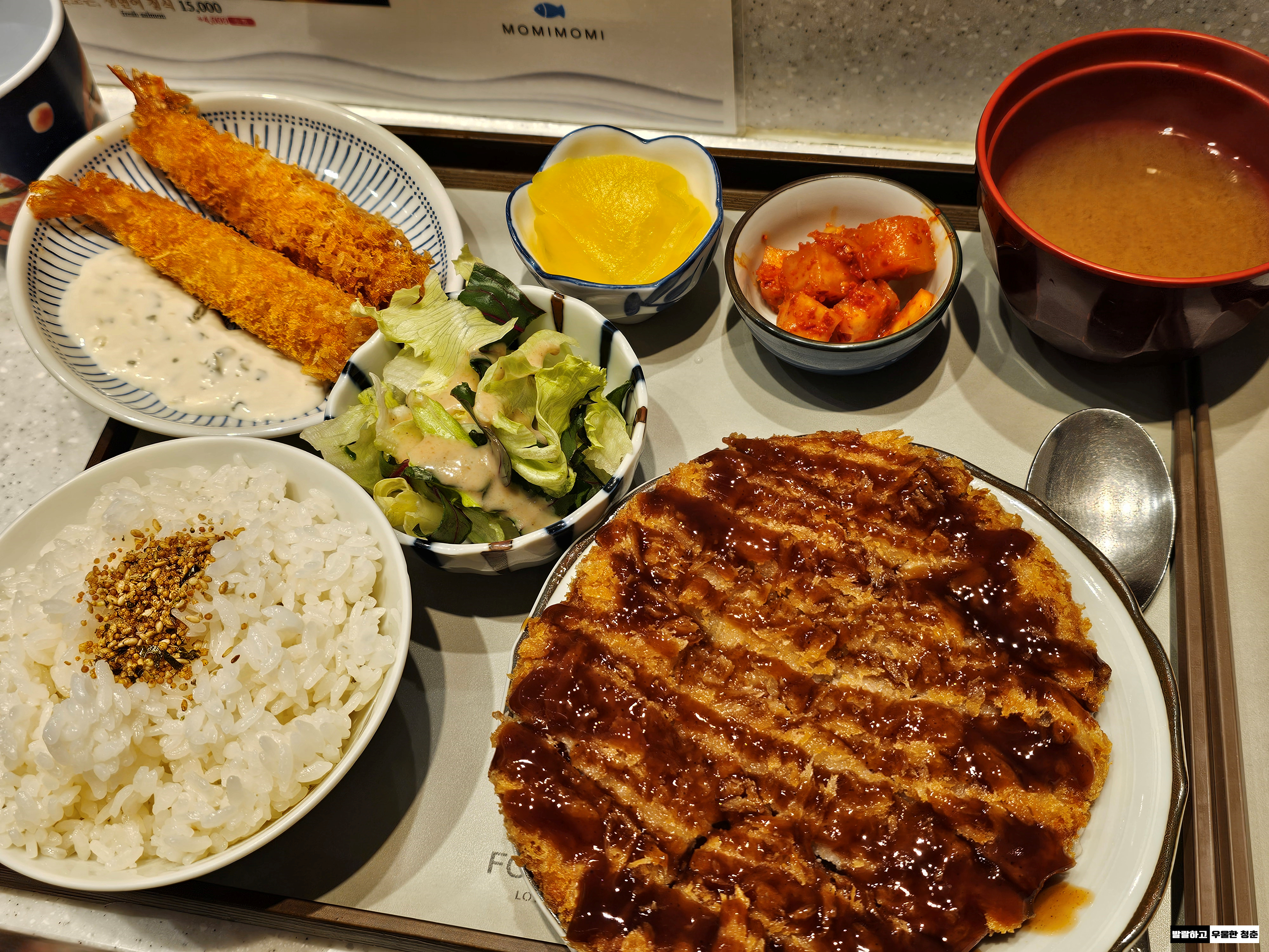 아이랑 먹는거다보니 돈가스 정식(12,000원)을 선택하고 새우튀김 2개(+3,000원) 더 해서 주문했다