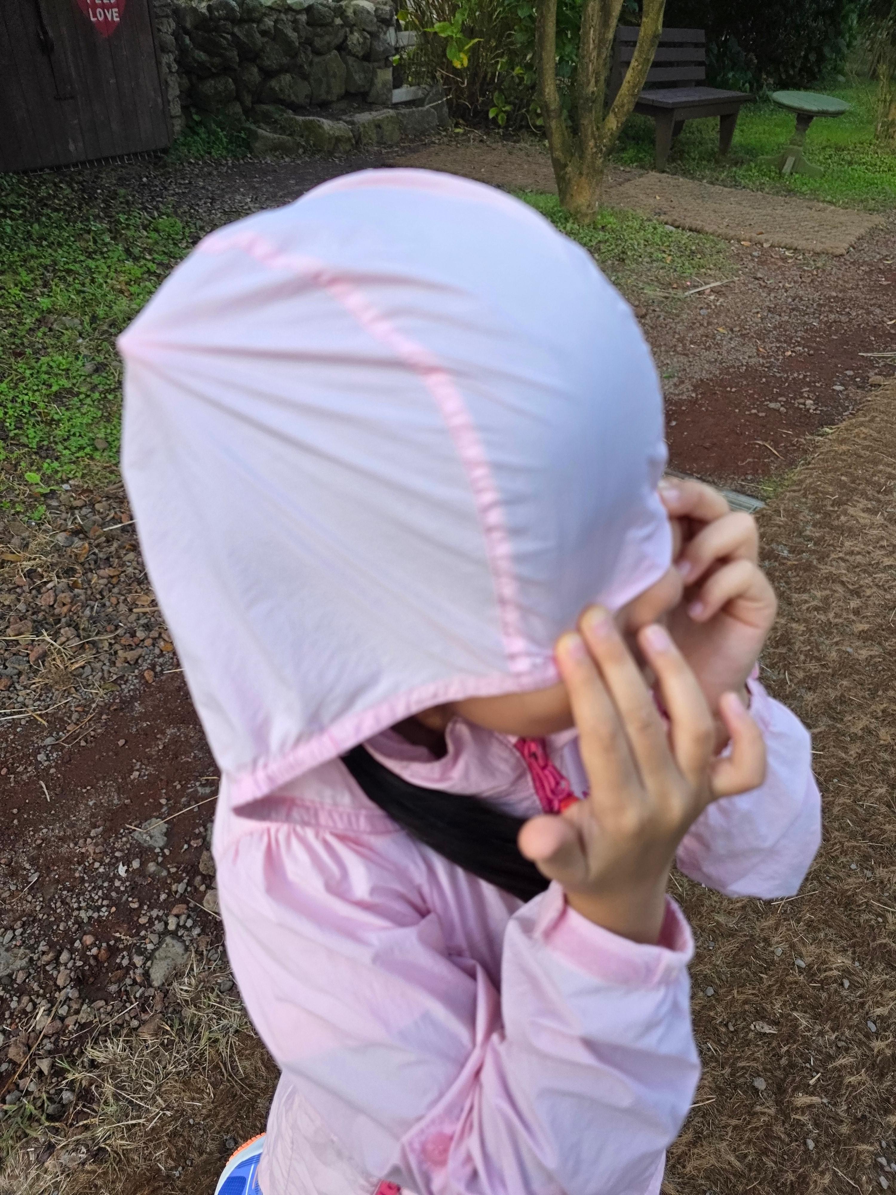 바람이 불어서 모자를 씌웠더니 장난 치는 중