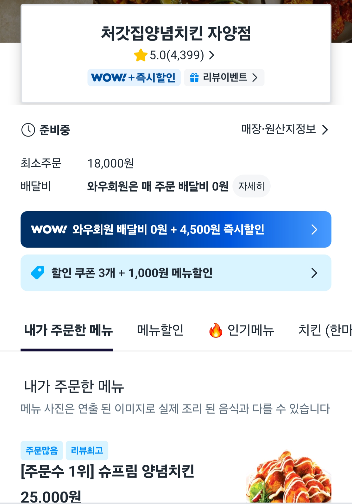 슈프림 양념치킨을 주문하고